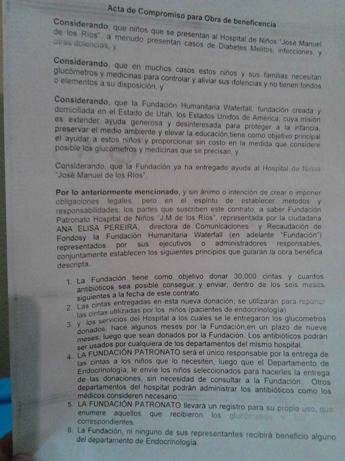 Thanks to a doctor at the J.M. de los Rios Children Hospital in Caracas the foundation became aware that children with diabetes mellitus did not have glucometers or strips to measure their sugar. The board decided that it was imperative to provide the aid requested. A written commitment was made to the children hospital in Caracas through Ms. Yvonne Sarmiento, an attorney who became the foundation’s volunteer representative in Caracas. All of foundation’s projects begin with a document of understanding with the hospital receiving the assistance. This is the document with the J.M. de los Rios Hospital: